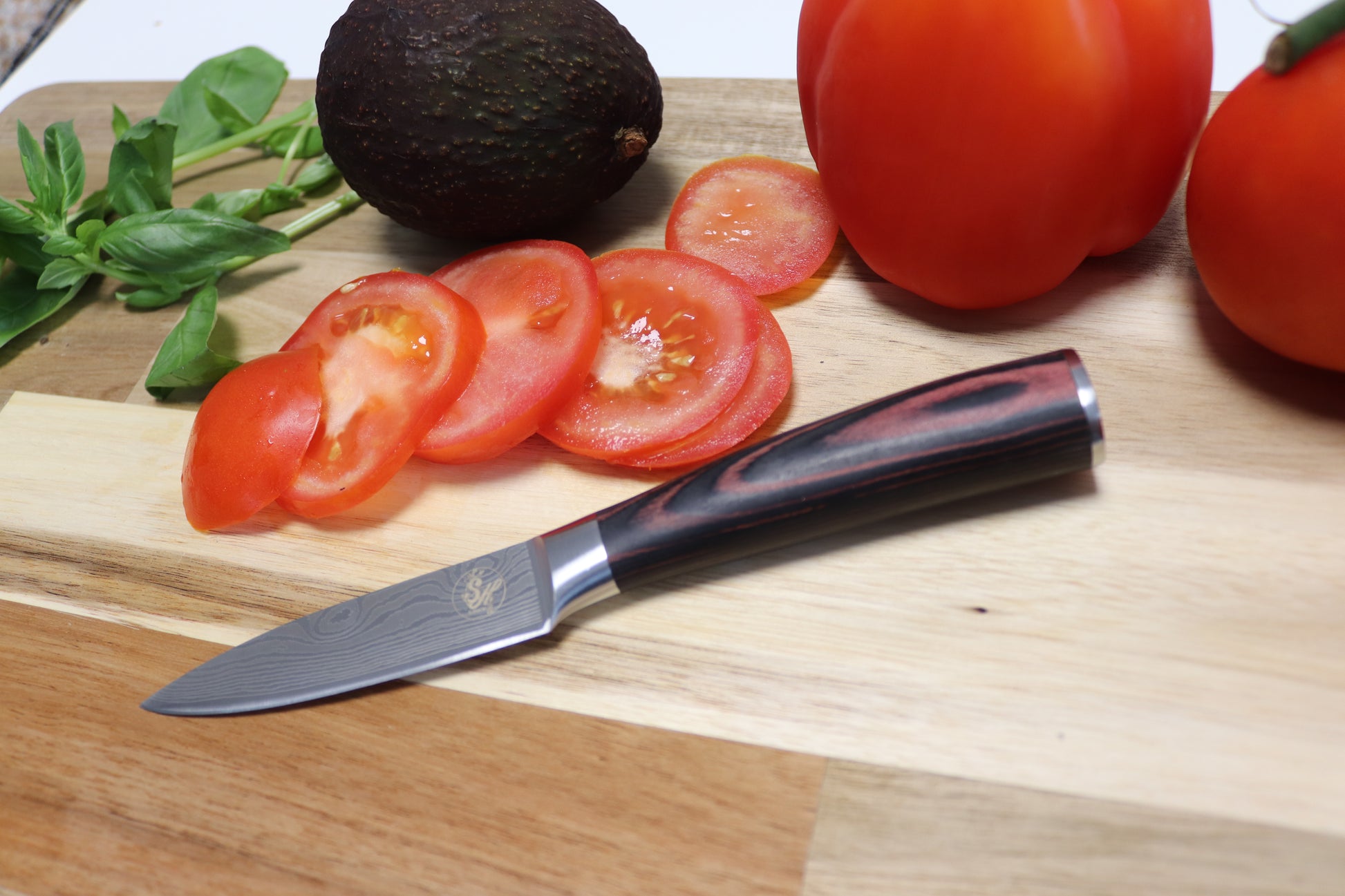 Hervorragendes Kochmesser: Das Schälmesser bewältigt mühelos Ihre täglichen Küchenaufgaben. Es eignet sich hervorragend zum Schälen, Schnitzen und für komplizierte Arbeiten. Es ist für kleine Küchenaufgaben wie Formen, Garnieren, Hacken, Trimmen und Zerkleinern von Gemüse und Obst konzipiert.